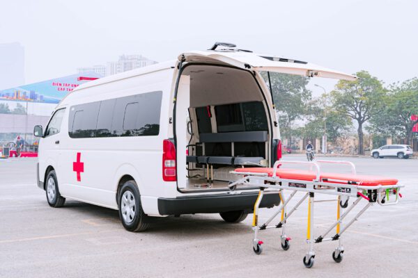 Ngoài ra, Toyota Hiace còn sở hữu đèn ưu tiên LED ở cả trước và sau, kết hợp cùng hệ thống còi và loa công suất lớn. Những trang bị này giúp các phương tiện khác dễ dàng nhận biết và nhường đường cho xe cấp cứu, đảm bảo lộ trình di chuyển thông suốt. Phần thép đỡ bánh của cáng bệnh nhân cũng được thiết kế đặc biệt, giúp việc vận chuyển trong các tình huống khẩn cấp trở nên nhanh gọn và an toàn hơn, thể hiện sự chú trọng tỉ mỉ đến từng chi tiết.
